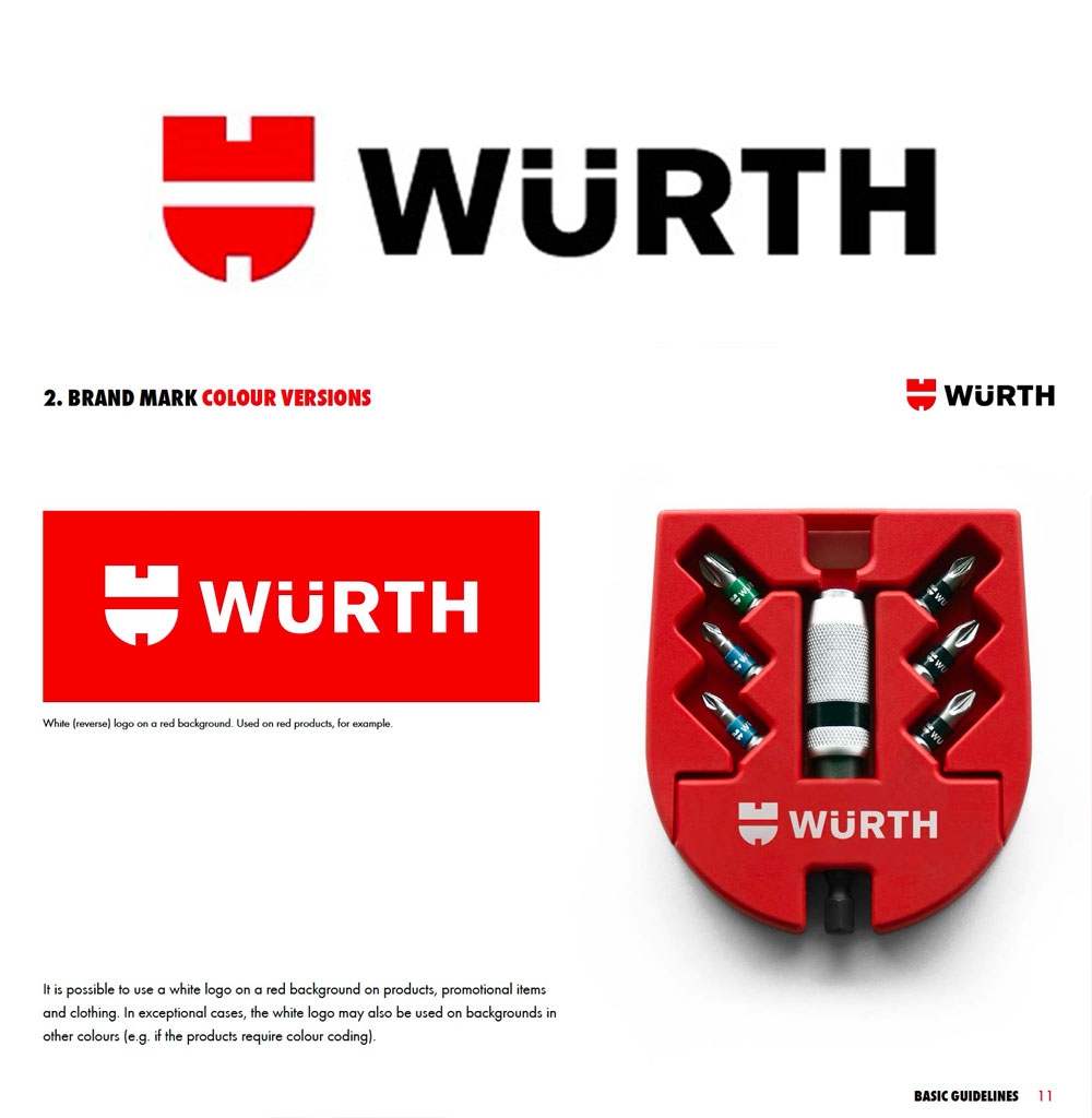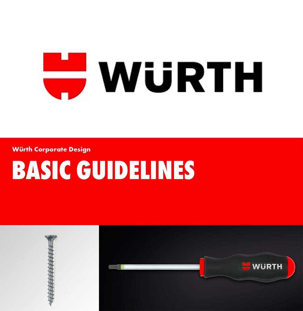 - Renkler: Würth kırmızısı (yaklaşık Pantone 185C/485C) ve siyah ana renklerdir.